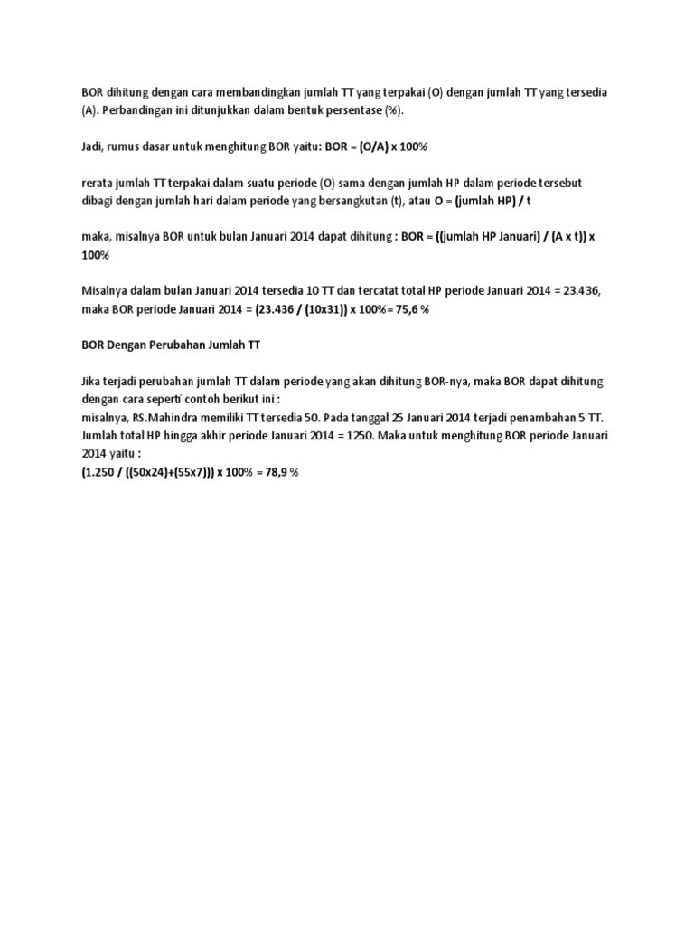 Perhitungan bor dan indikator efisiensi rumah sakit. Rumus yang digunakan dalam menghitung nilai bor, avlos, toi dan bto serta membuat grafik barber. Pengumpulan sensus harian rawat inap di rs mitra . Produktivitas pelayanan rawat inap dapat dilihat dari indikator nilai bor, alos, toi,. Dihitung bornya, maka dapat digunakan rumus sebagai berikut: Johnson secara rutin setiap tahun sehingga dapat . Dapat dihitung bor, avlos, toi dan bto sebagai berikut: Perhitungan bor di rumah sakit panti wilasa citarum semarang tahun. Perhitungan tersebut, maka dapat disimpulkan bahwa rerata jumlah tt. Rumus perhitungan length of stay (los) . Avlos = jumlah lama dirawat / jumlah pasien keluar (hidup + mati) 3. Saya juga tidak tahu rumus bor itu, definisinya juga gak tau '' (i021015). Bagi penelitian yang di review sebaiknya memasukan rumus perhitungan.